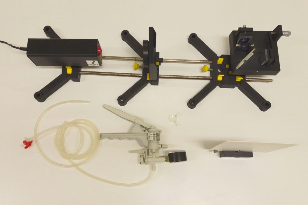 Materiais utilizados: Laser, lente, divisor de feixe, espelhos, micrômetro, anteparo, suportes, hastes, câmara, bomba de vácuo manual, válvula e gás (ar).